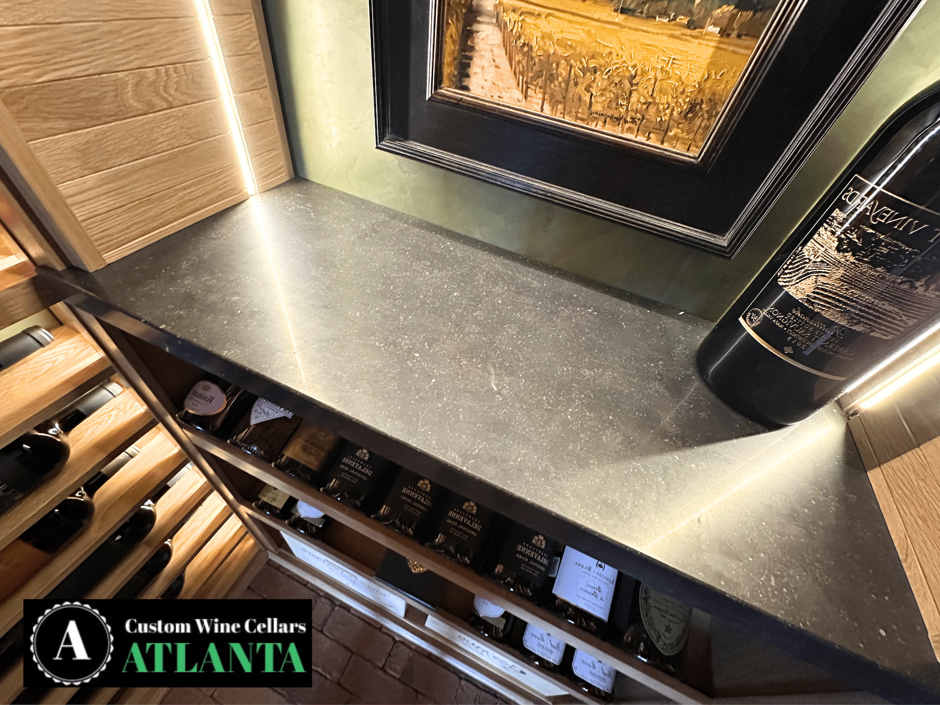 Among the most functional custom basement wine cellar ideas, adding a stone countertop creates a natural pause point for serving, staging bottles, or simply appreciating the collection.