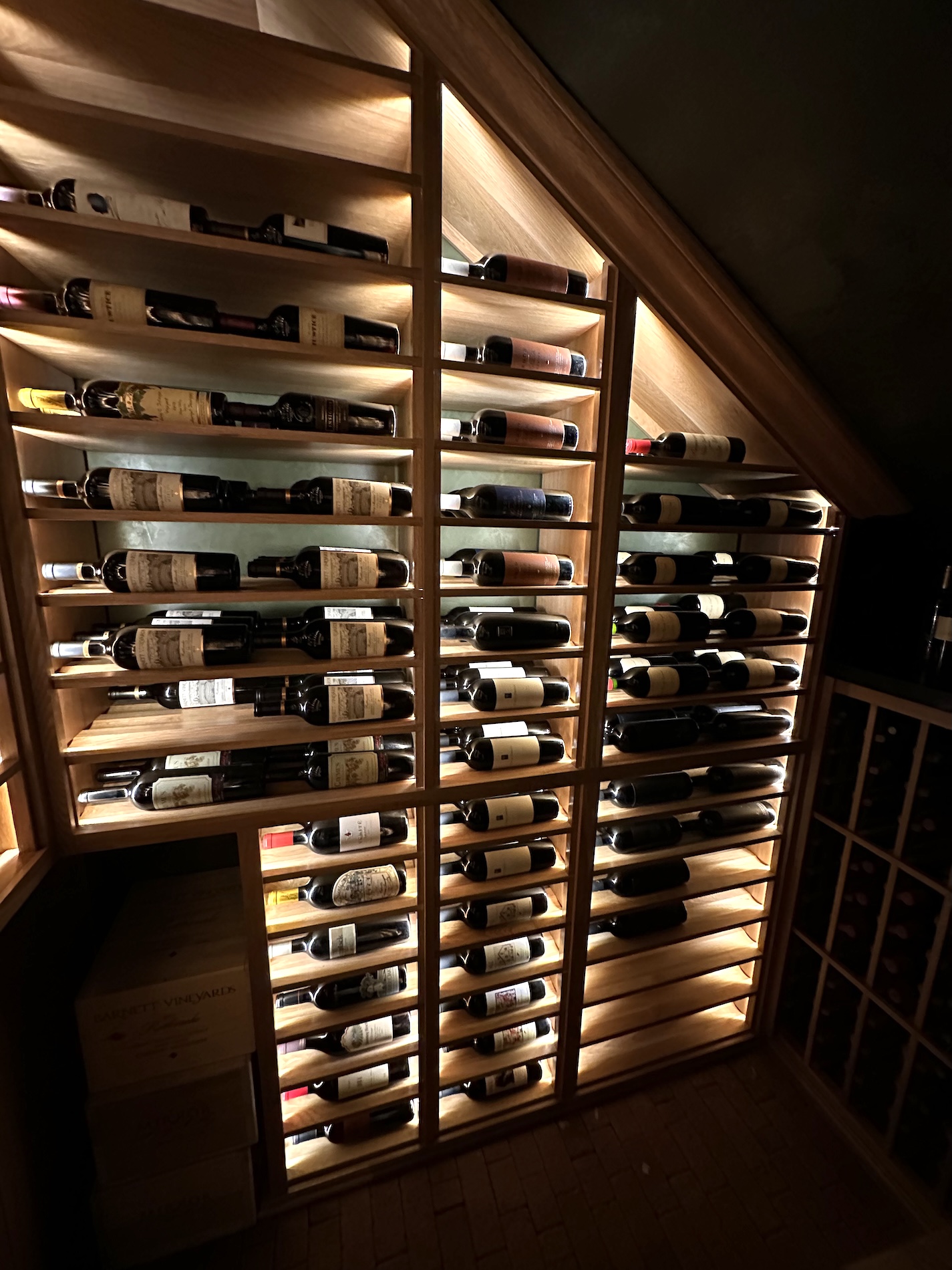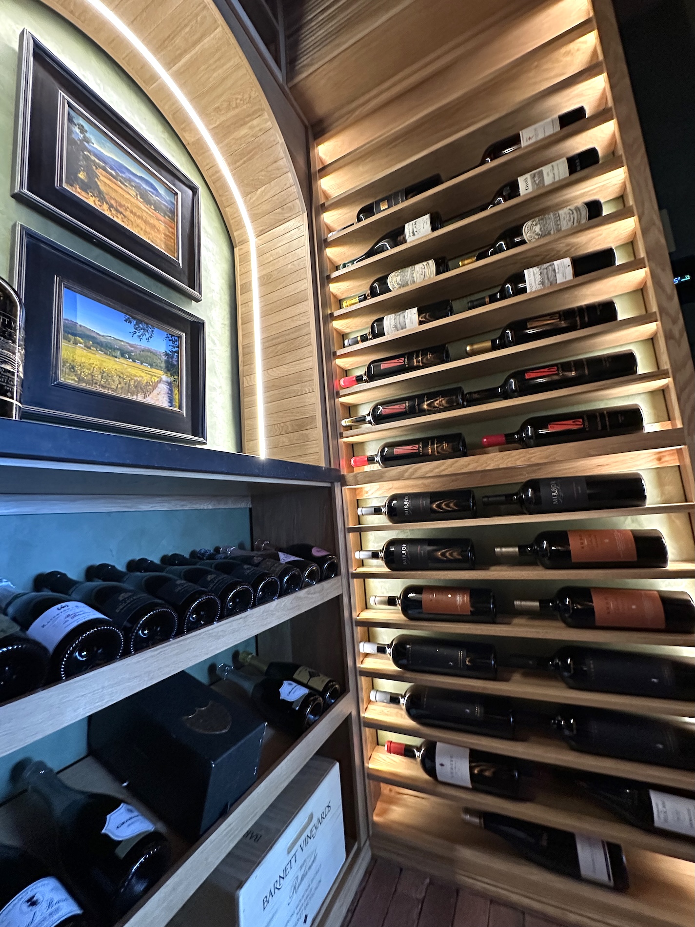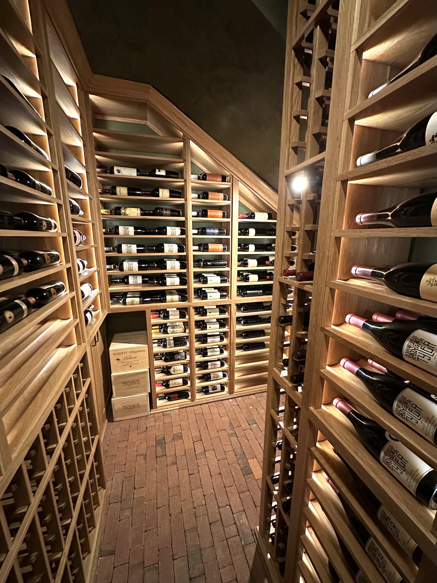 Behind the scenes, the cellar is engineered to support proper aging conditions. A wall-mounted cooling system was installed near the ceiling to maintain a consistent 55°F while preserving wall space for wine storage.