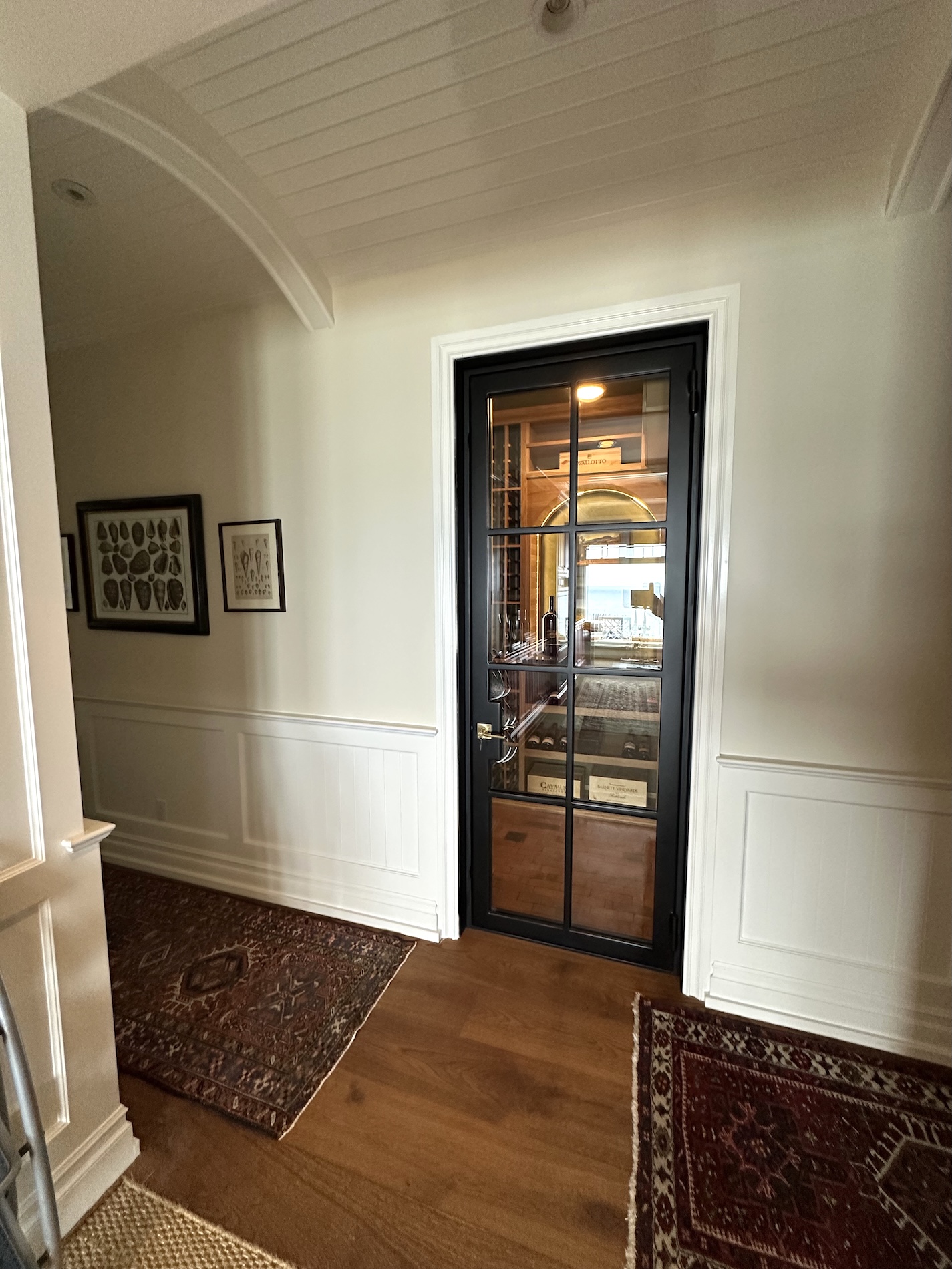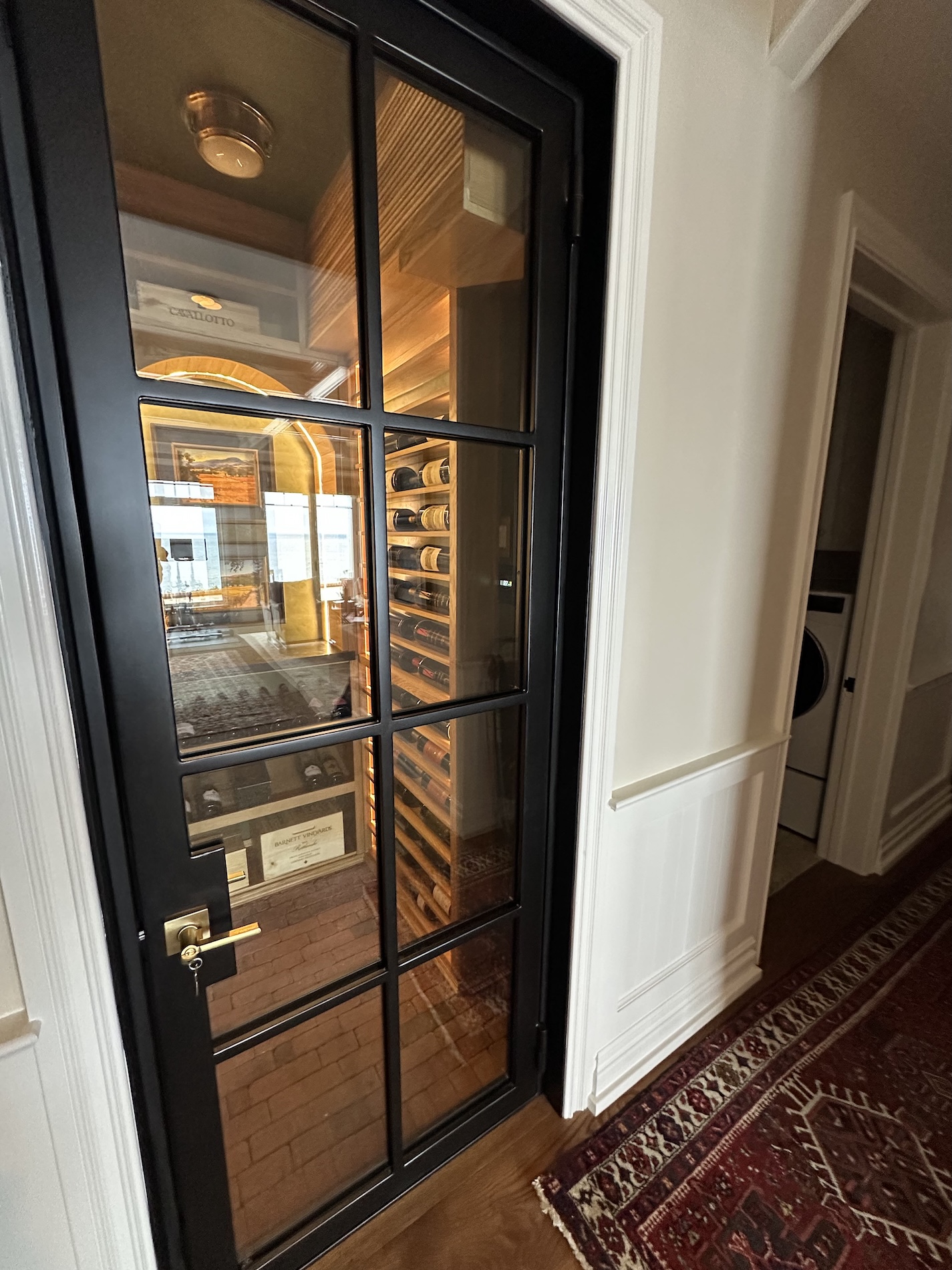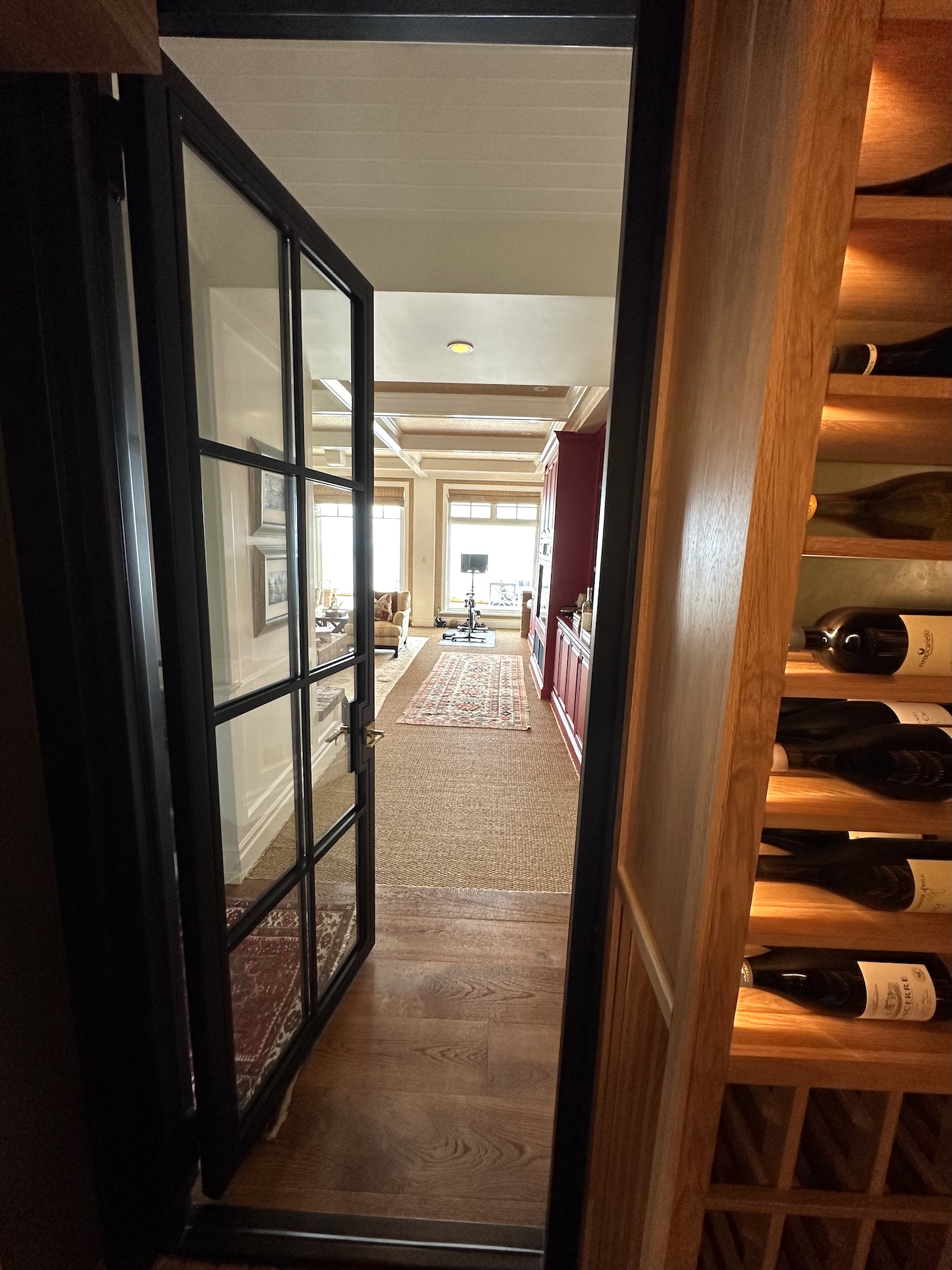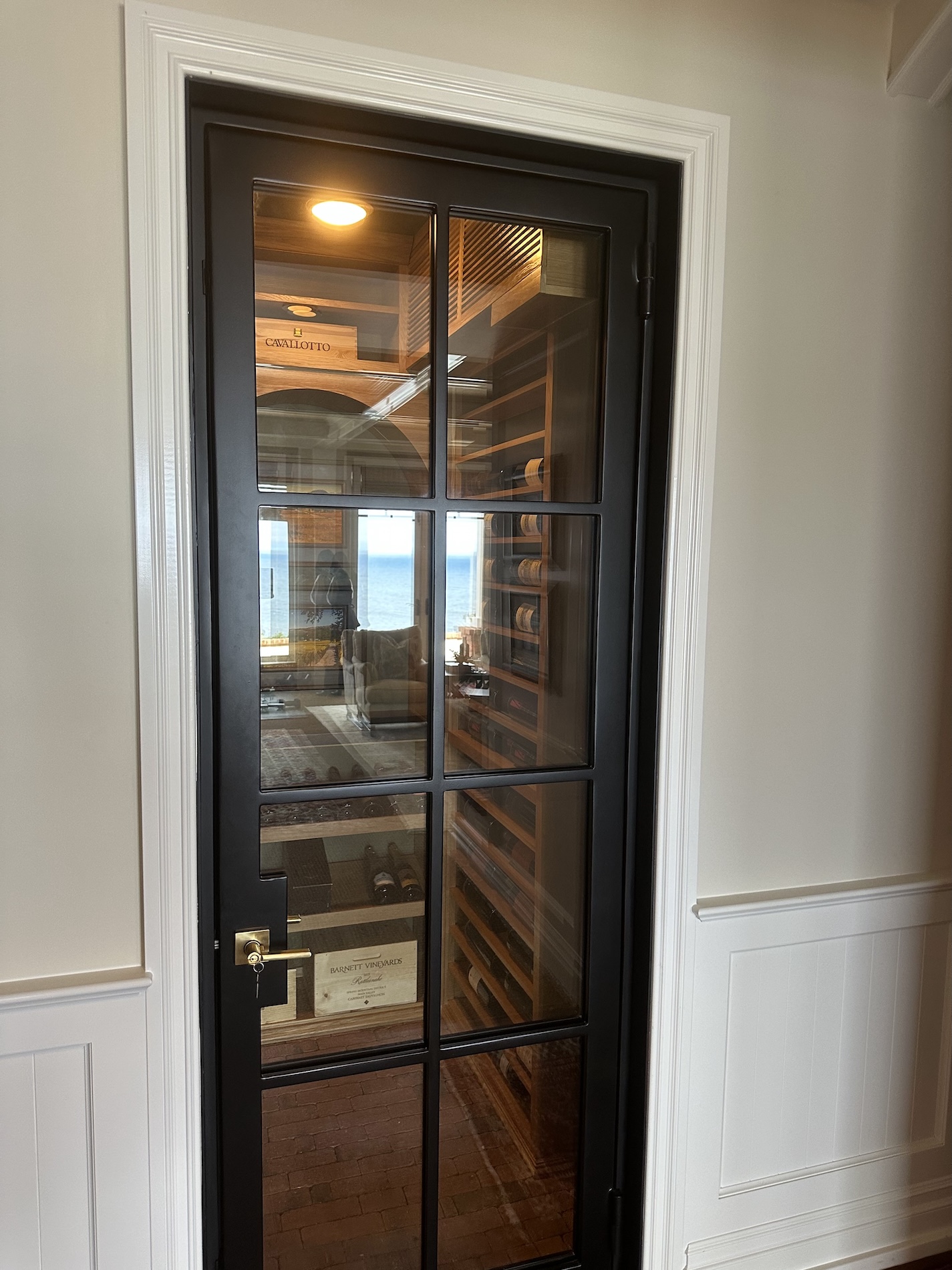 The entrance plays a defining role in the overall design. Glass French doors with dual-paned construction provide a clear visual connection to the cellar while maintaining the insulated environment required for wine storage. Custom steel detailing adds structure and balance, while the warm-toned hardware introduces a subtle contrast that enhances the room’s elegance.